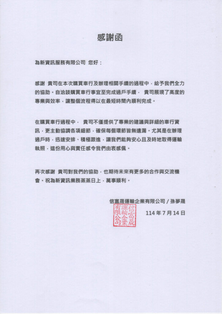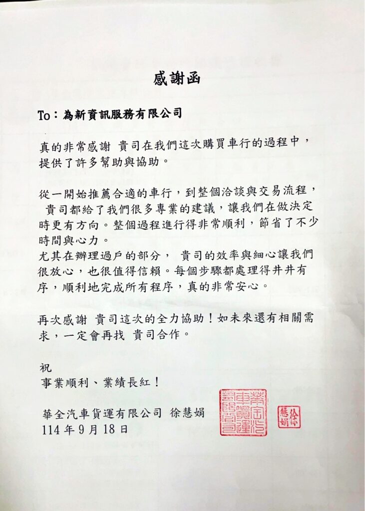 為新公司也現金高價收購欲讓出經營權的貨運公司!前提是乾淨能提供:公司核准函/變更登記表/公司章程/運輸執照/公會證書/三年財報/無欠稅證明/聯徵報告!評估可以三天內付頭期款!